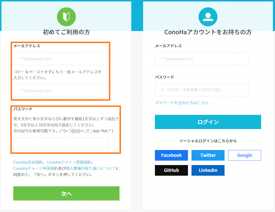 初めてご利用の方のほうに、「メールアドレス(2回)」と「パスワード」を入力し、「次へ」をクリックします。